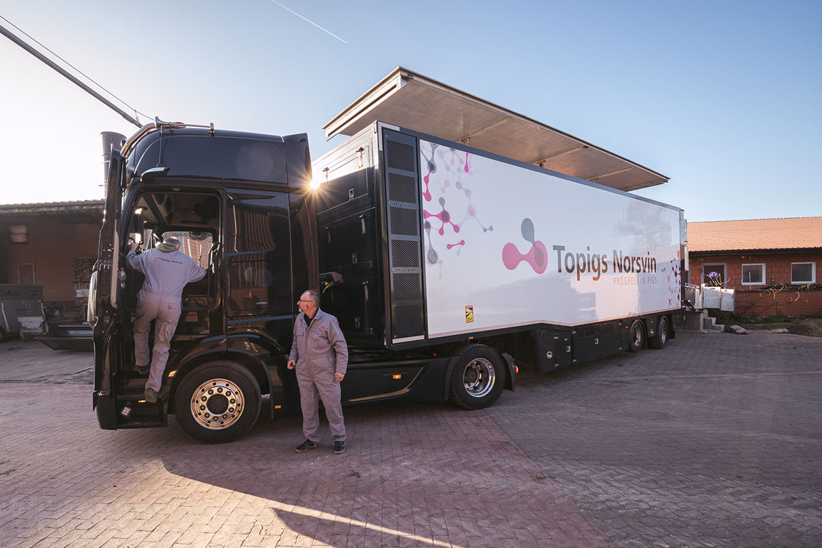Wer den LKW mit dem Logo von Topigs Norsvin auf der Seite sieht, mag sich fragen, was dort wohl drin ist. Die Antwort: High-Tech, und zwar zum Wohle der Tiere.