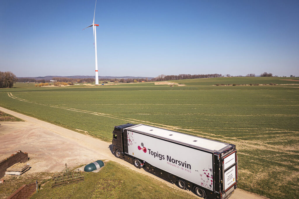 Wer den LKW mit dem Logo von Topigs Norsvin auf der Seite sieht, mag sich fragen, was dort wohl drin ist. Die Antwort: High-Tech, und zwar zum Wohle der Tiere.