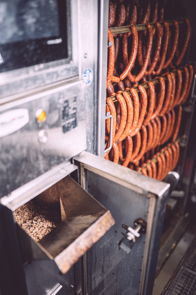 Die Mischverhältnisse der Zutaten, Temperaturen und was man sonst noch wissen muss, um die begehrten „Zweiender“ schmackhaft zu gestalten. Und geräuchert werden die guten Stücke ebenfalls in der hauseigenen Produktion. Nicht mit irgendwelchen Zusätzen wie Lake oder Ähnlichem, sondern ganz klassisch. Wie damals eben. Ganz „old school“.